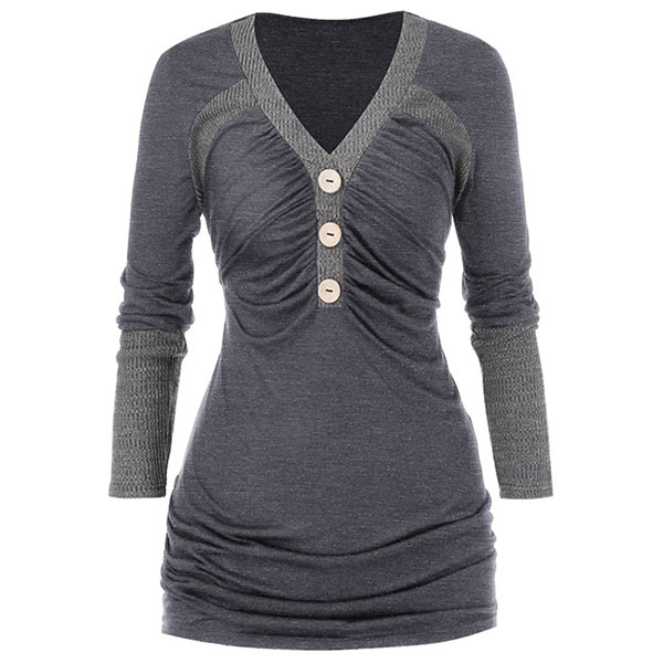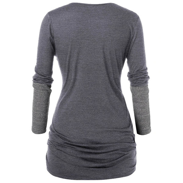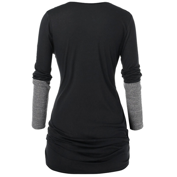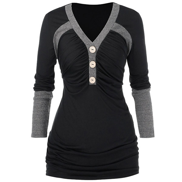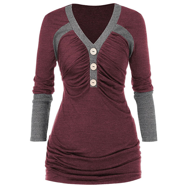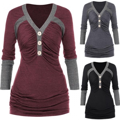 Fashion Contrast Color Long Sleeve V-neck Wrinkled T-shirt