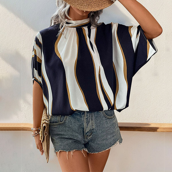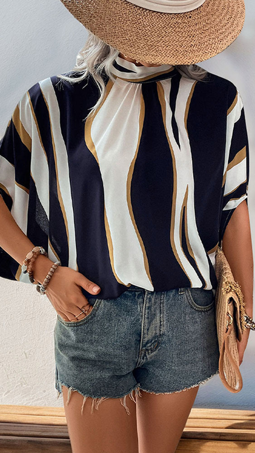 Fashion Contrast Color Mock Neck Batwing Sleeve Shirt