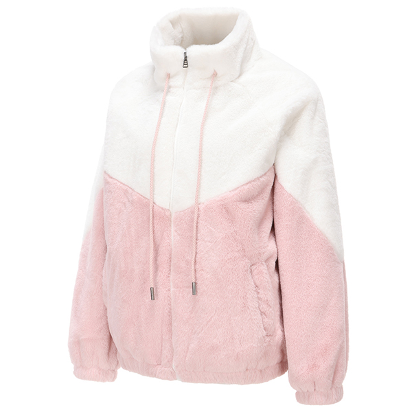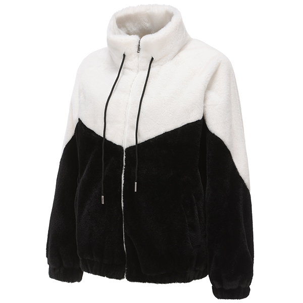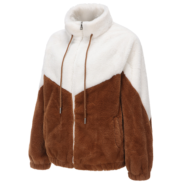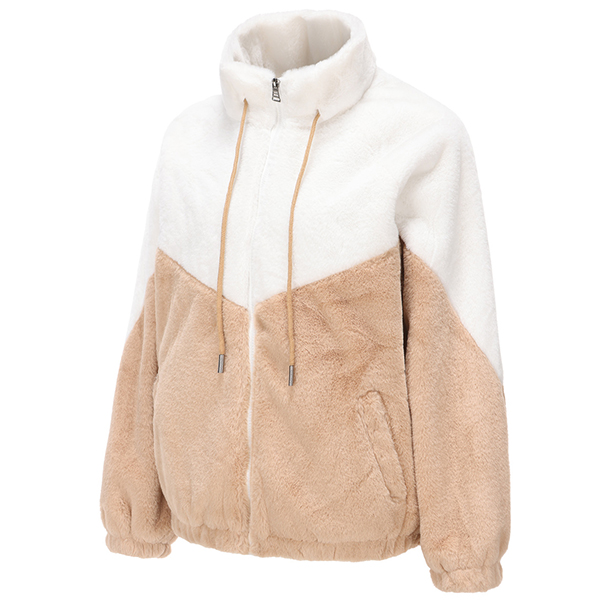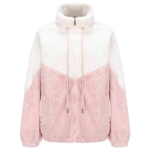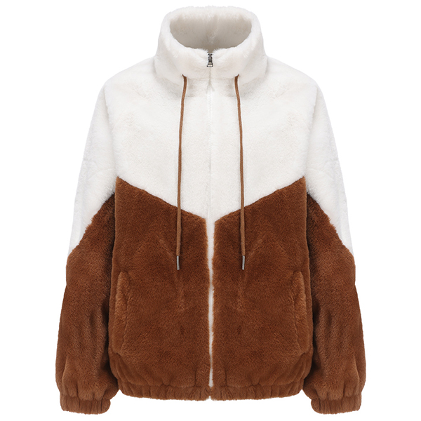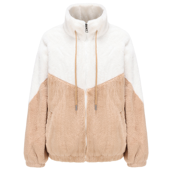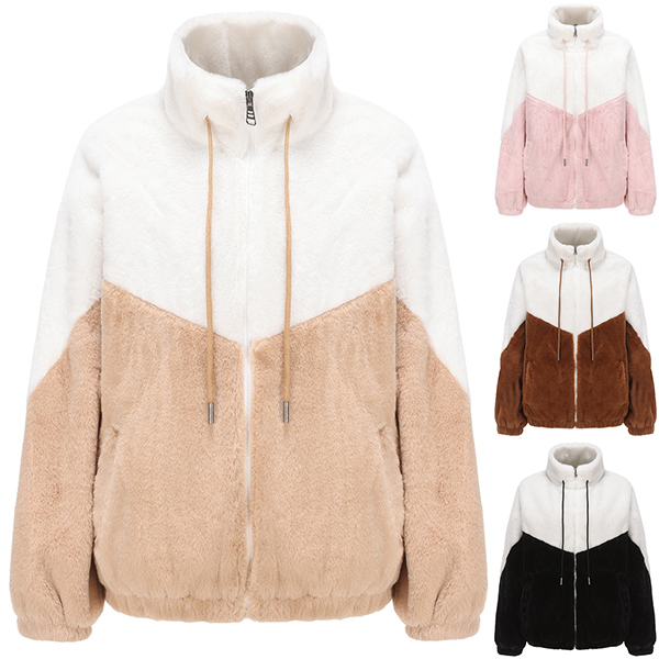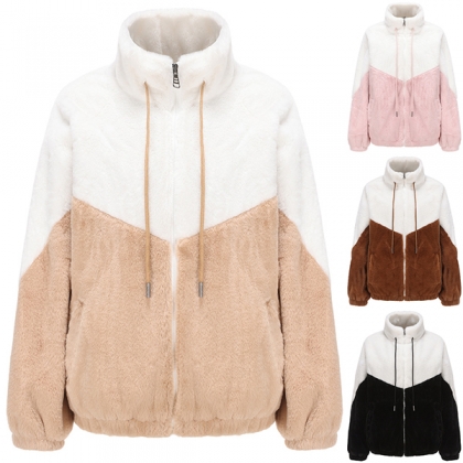 Fashion Contrast Color Mock Neck Long Sleeve Drawstring Front Zipper Plush Jacket