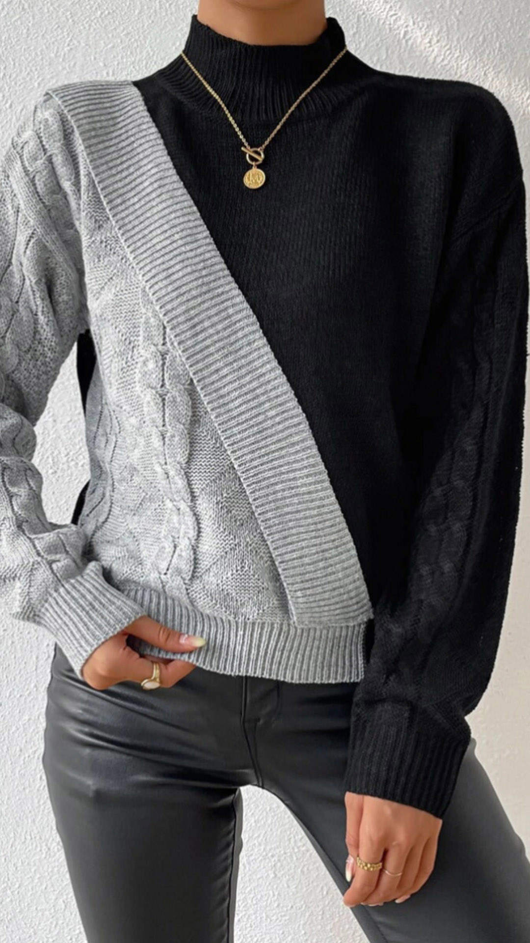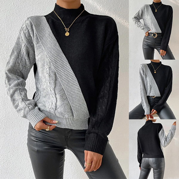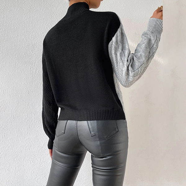 Fashion Contrast Color Mock Neck Long Sleeve Ribbed Knitted Sweater