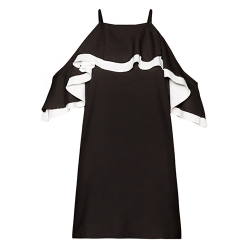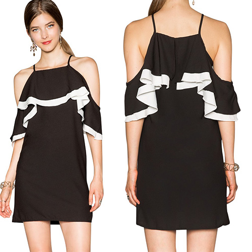 Black and white are always popular among color world especially when they are together. This dress features black and white contrast color design,fashion and popular. Sling style,lotus sleeve with off-shoulder design and flouncing design. A good choice for you in summer.