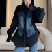 Fashion Contrast Color Old-washed Denim Spliced Long Sleeve Cinch Waist Blouse