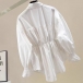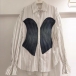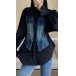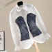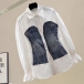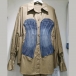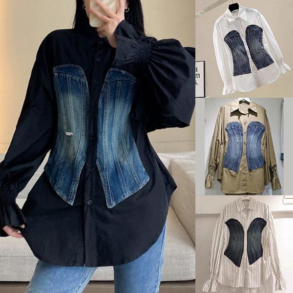 This is a unique and stylish shirt that combines contrasting denim colors spliced design, long sleeves, and a cinched waist for a modern and edgy look. This blouse is a must-have for those who love to experiment with different textures and designs.