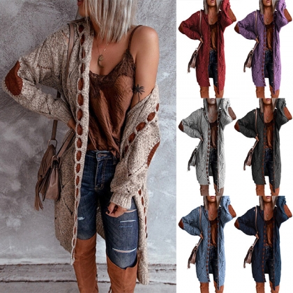 A perfect combination between cozy with a dash of style, this knit cardigan is truly a perfect choice for you in these autumn days. The patch spliced design at the sleeve part will break the simple and dull design style. Finished with long sleeve and a loose silhouette,this knit cardigan can be matched with your dresses or the combo of t-shirts and jeans.