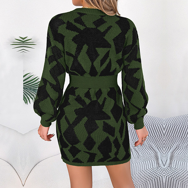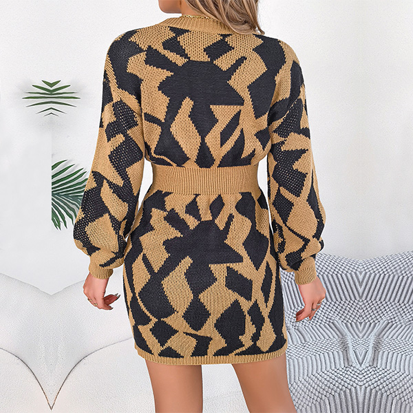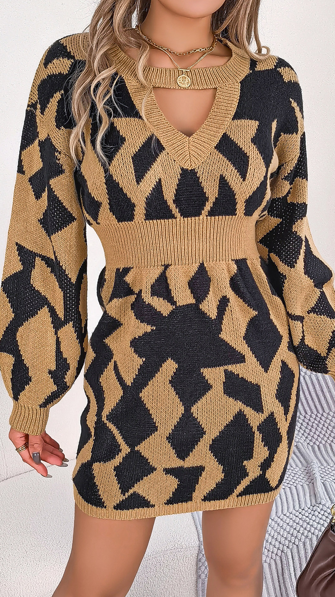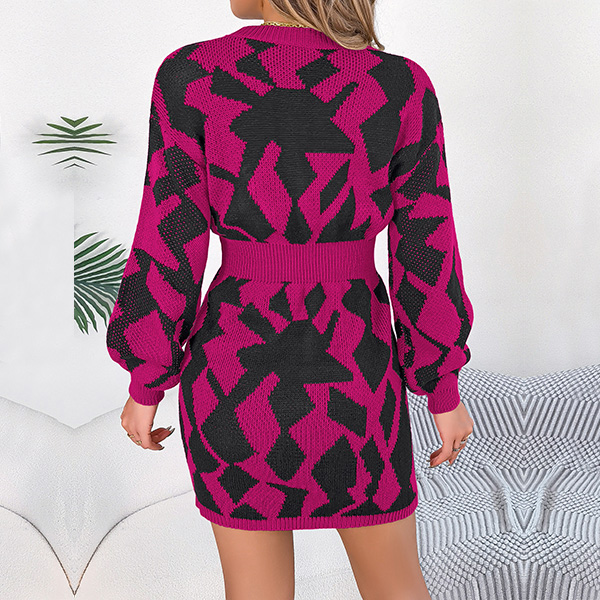 Fashion Contrast Color Pattern Front Cutout Laterm Long Sleeve Knitted Sweater Dress