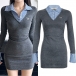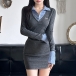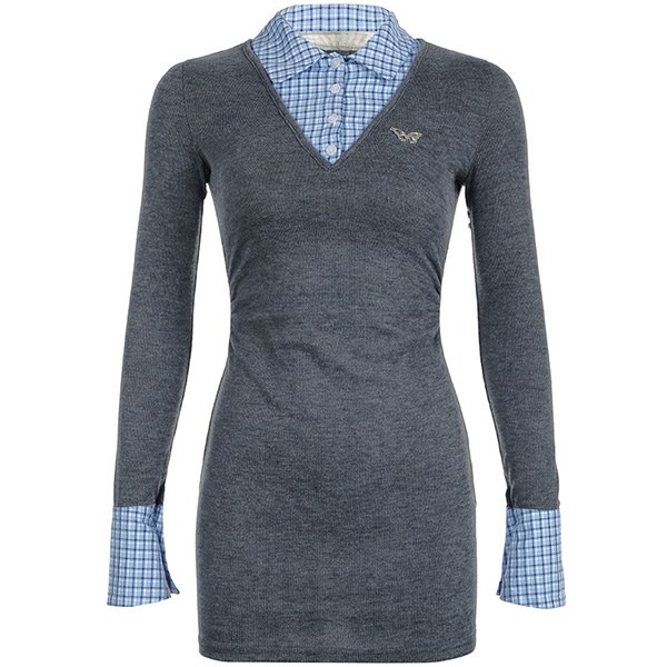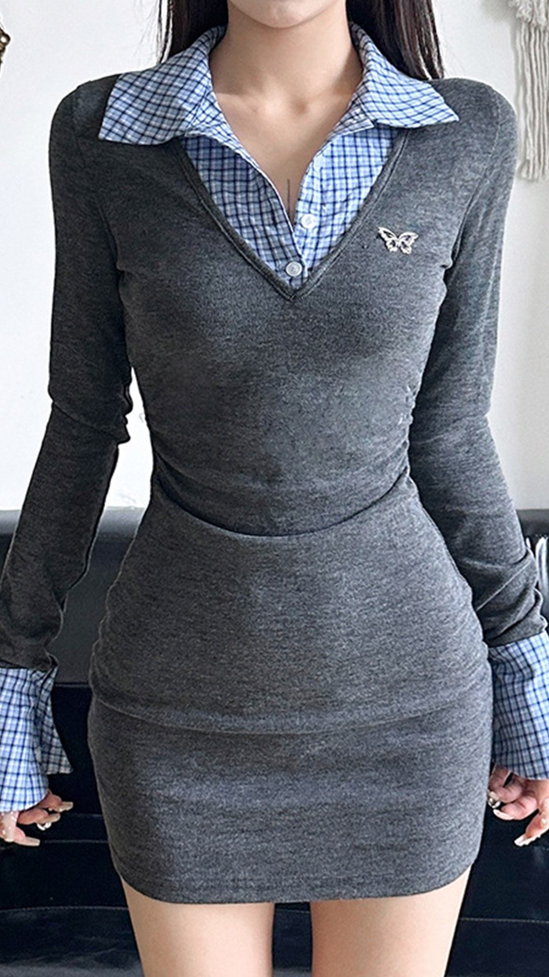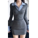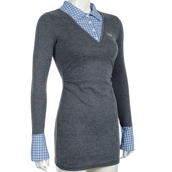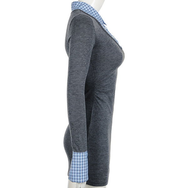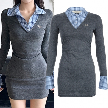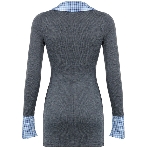 This dress features contrast color plaid splicing along the Polo neck and cuff, and a bodycon fit, creating a chic and sophisticated look that is perfect for both casual and dressy occasions.