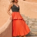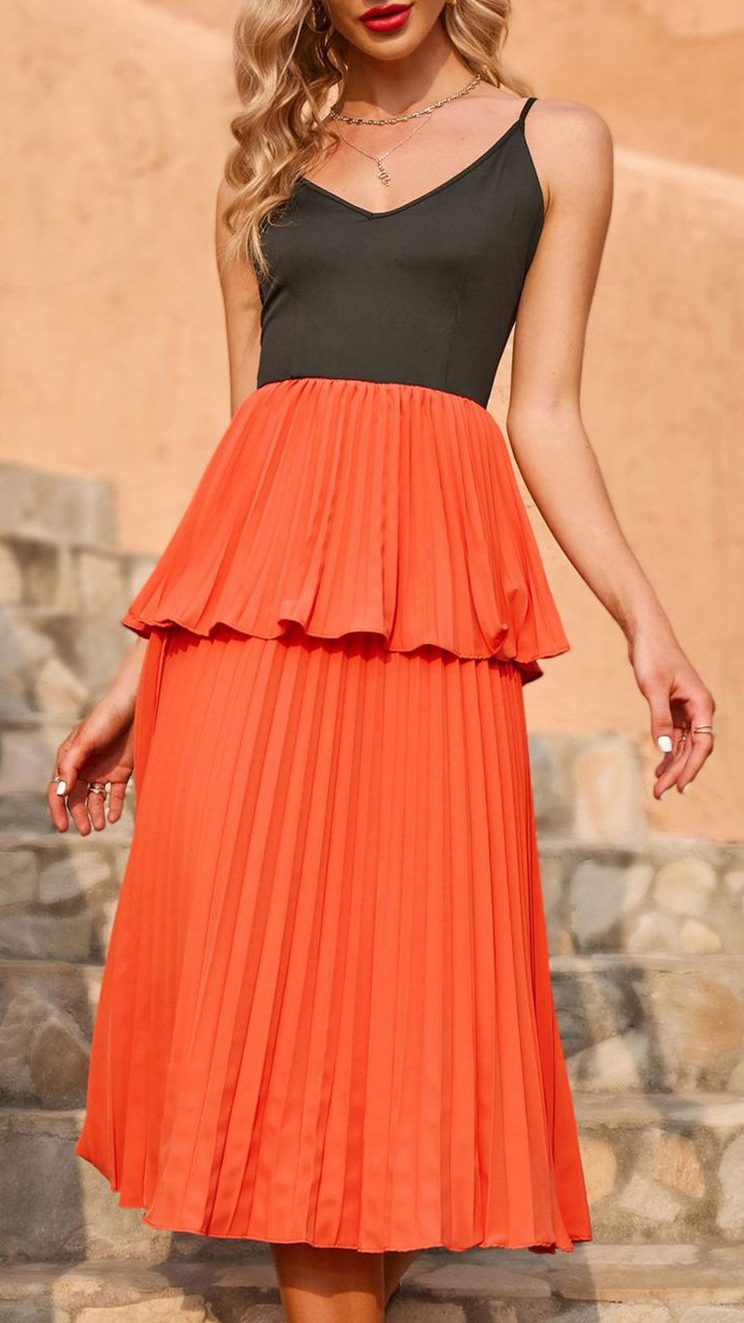 Embrace your unique style and embrace the elegance and playfulness with this chic and trendy piece. This slip dress features a contrasting color design, with different hues complementing each other to create a visually striking look. The pleated detailing adds texture and movement to the dress, creating a flowy and flattering silhouette.