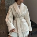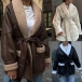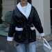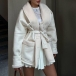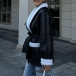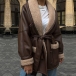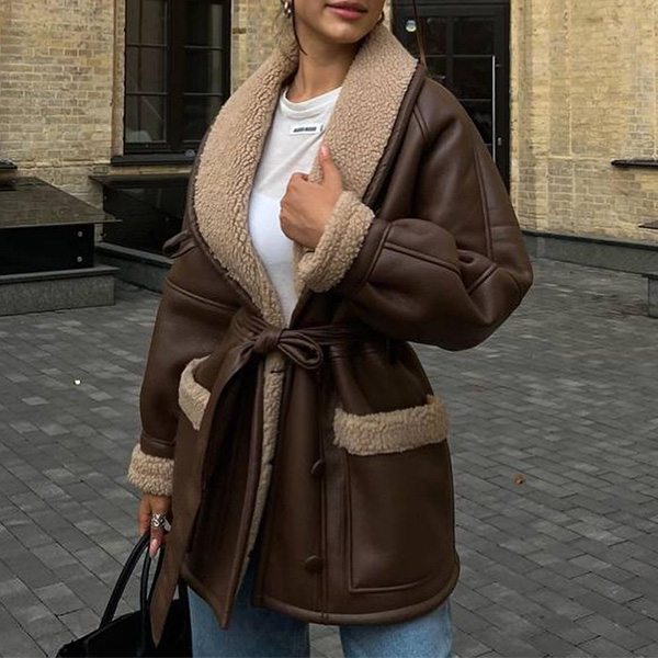 Fashion Contrast Color Plush Lined Lapel Long Sleeve Patch Pockets Self-tie Artificial Leather PU Jacket