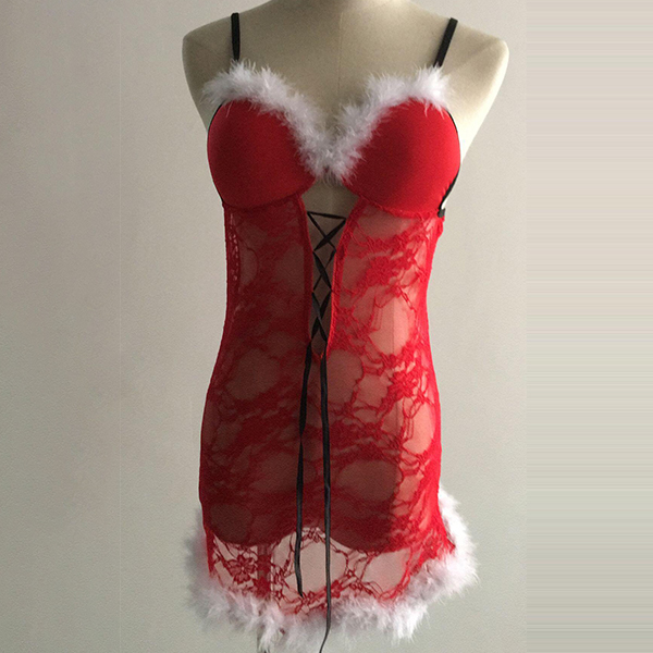 Fashion Contrast Color Plush Spliced Lace Self-tie Lingerie Bodysuit for Christmas