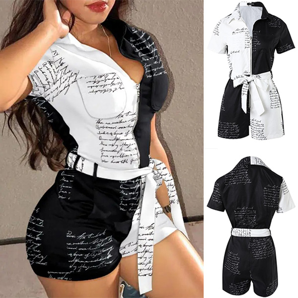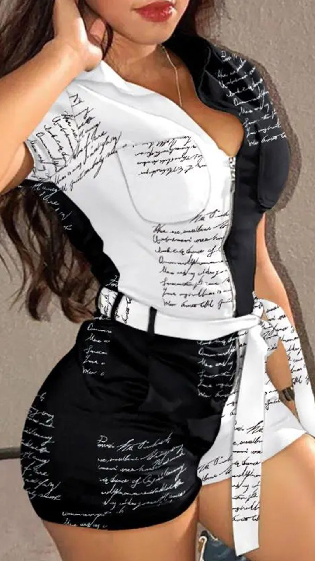 Fashion Contrast Color Printed Front Zipper Self-tie Romper