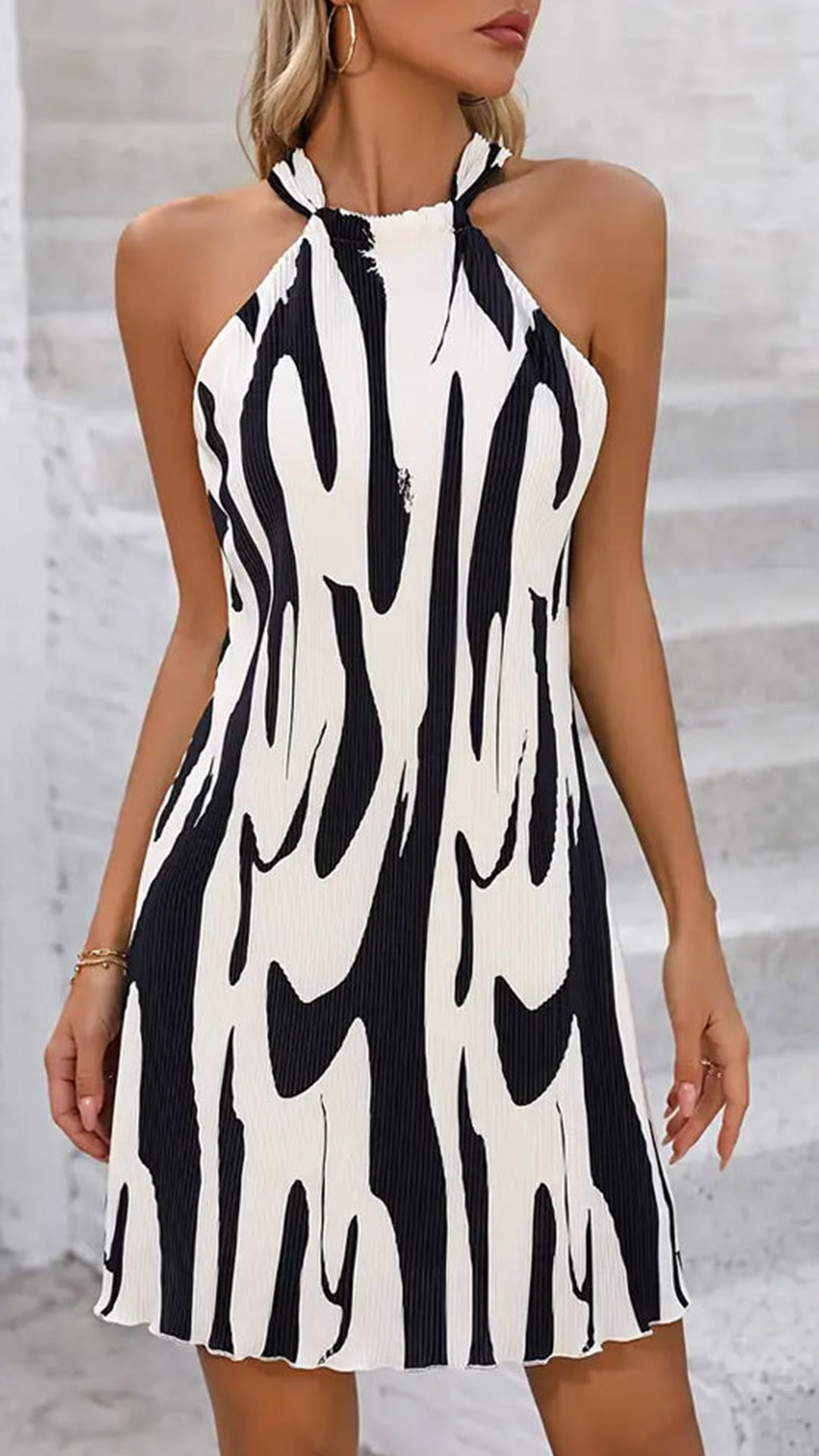 This chic and eye-catching mini dress is a standout piece that combines bold, contrasting colors with a playful printed pattern and a flattering halterneck silhouette. Wanna have a try?
