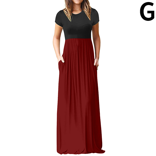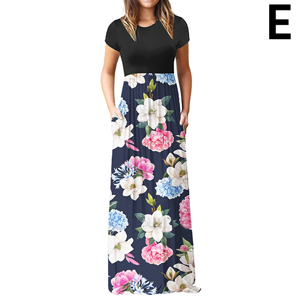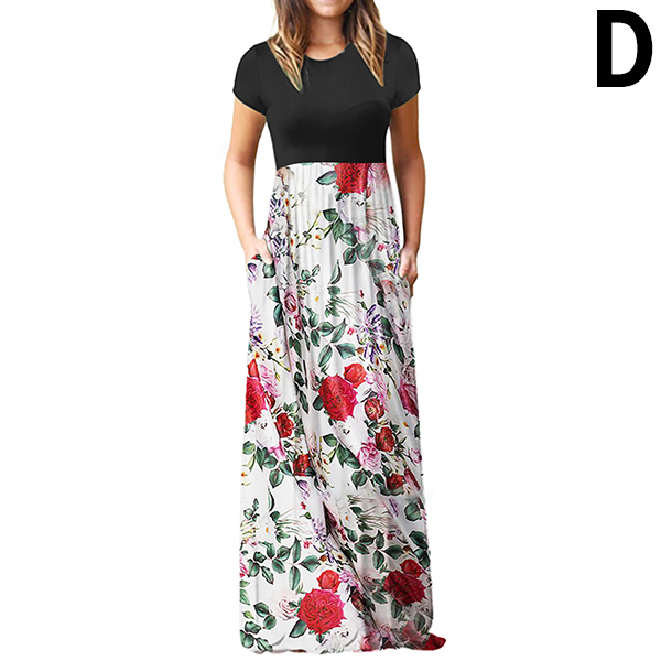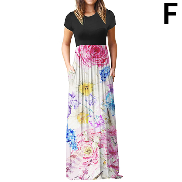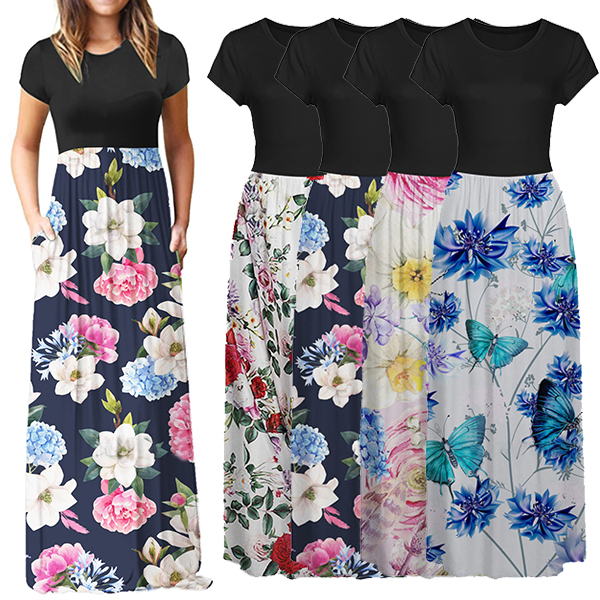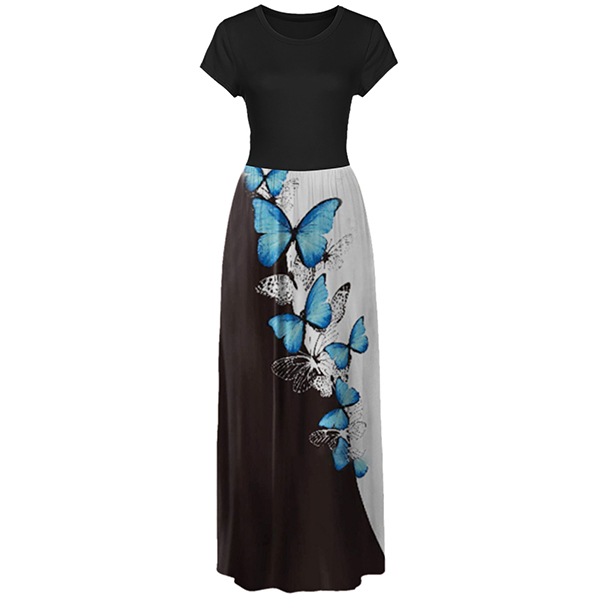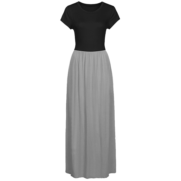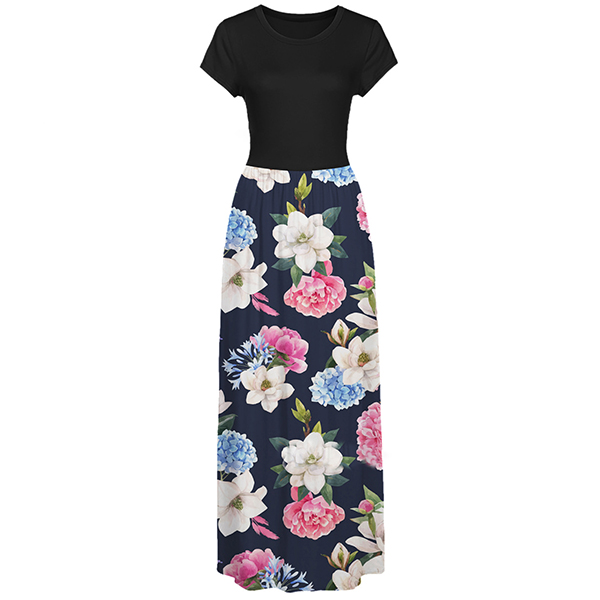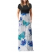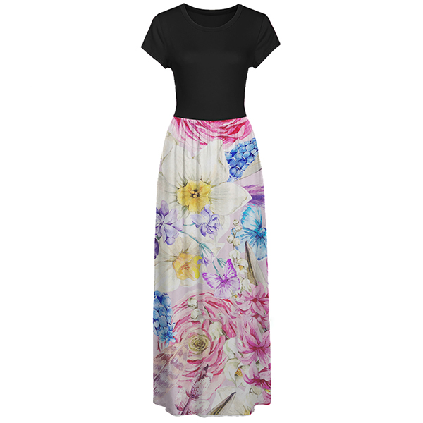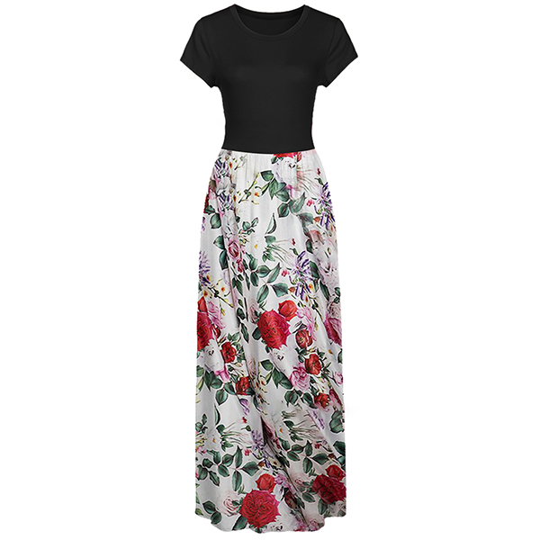 Fashion Contrast Color Printed Short Sleeve Round Neck High Waist Maxi Dress
