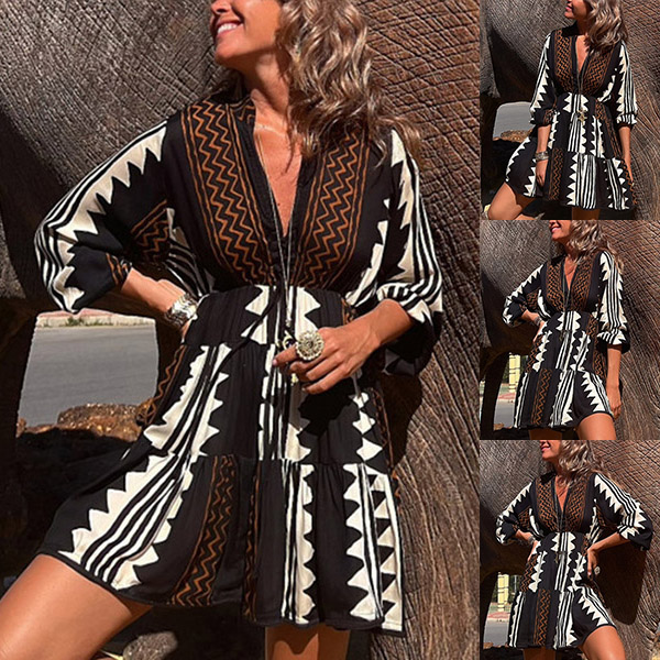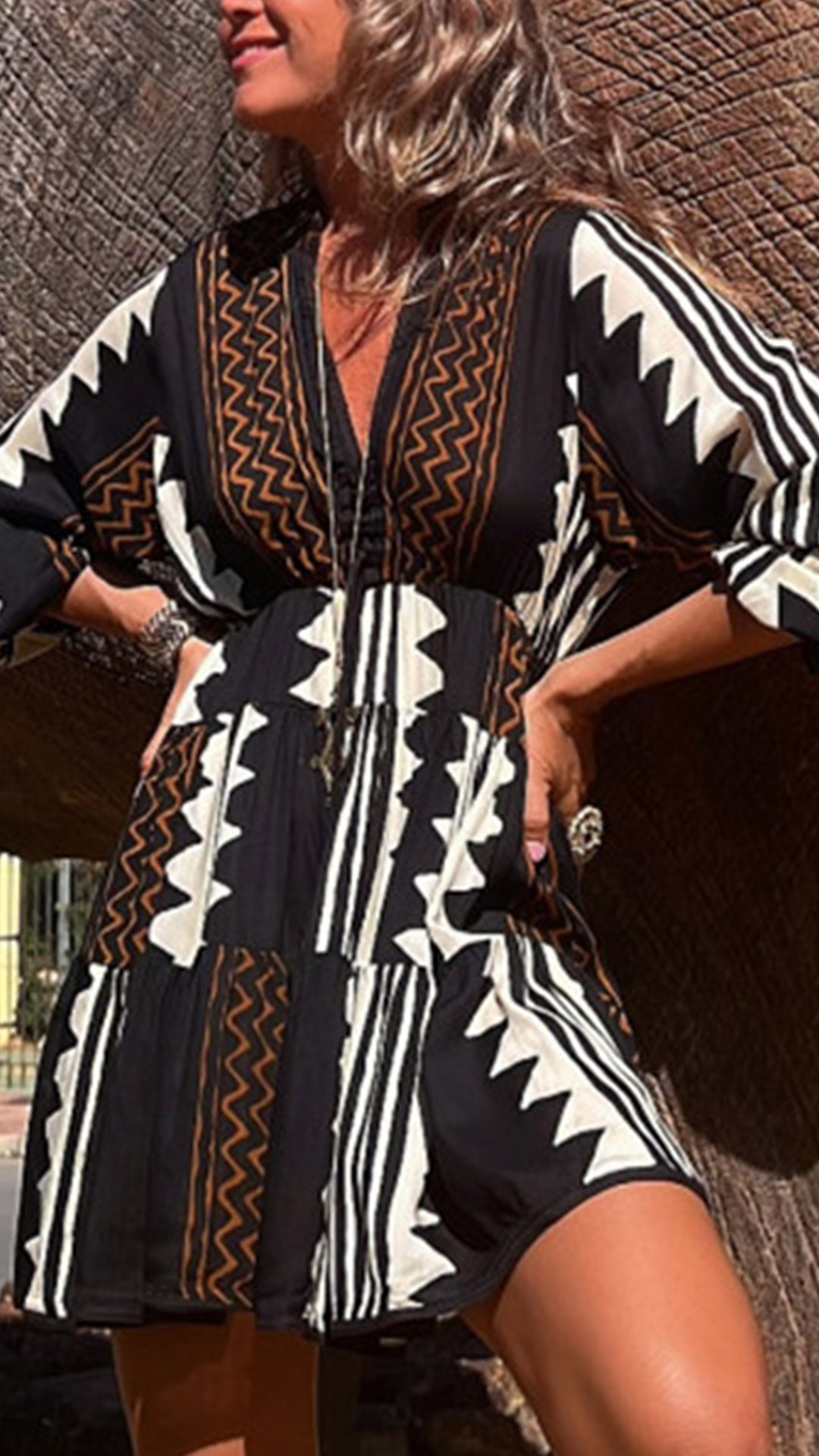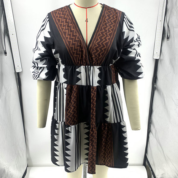 Fashion Contrast Color Printed V-neck Elbow Sleeve Dress