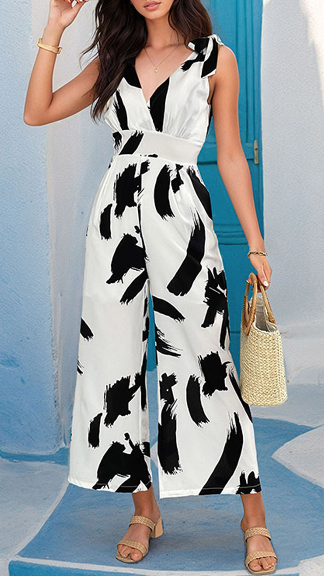 This jumpsuit combines a vibrant and eye-catching contrast color print with a flattering V-neckline and a sleeveless design, creating a stylish and trendy ensemble that is sure to turn heads.