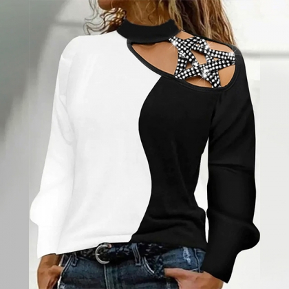 Fashion Contrast Color Rhinestone Star Open Shoulder Long Sleeve Mock Neck Shirt