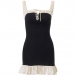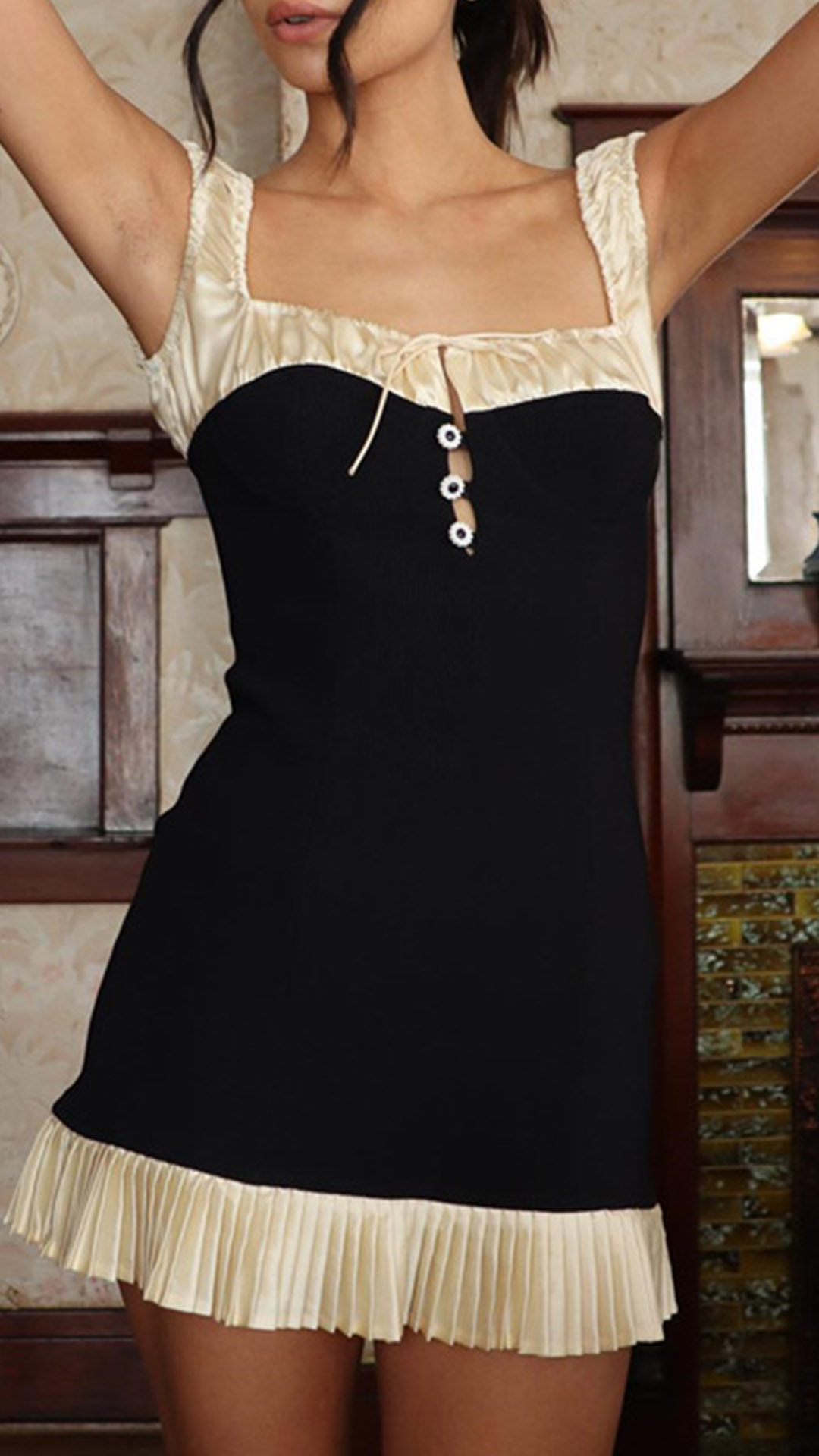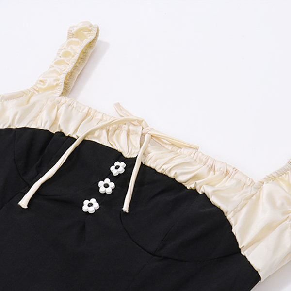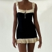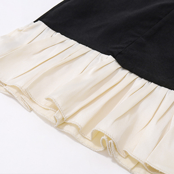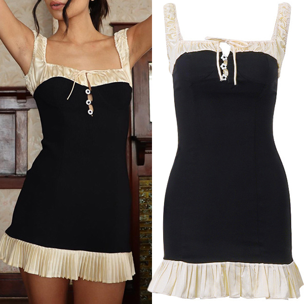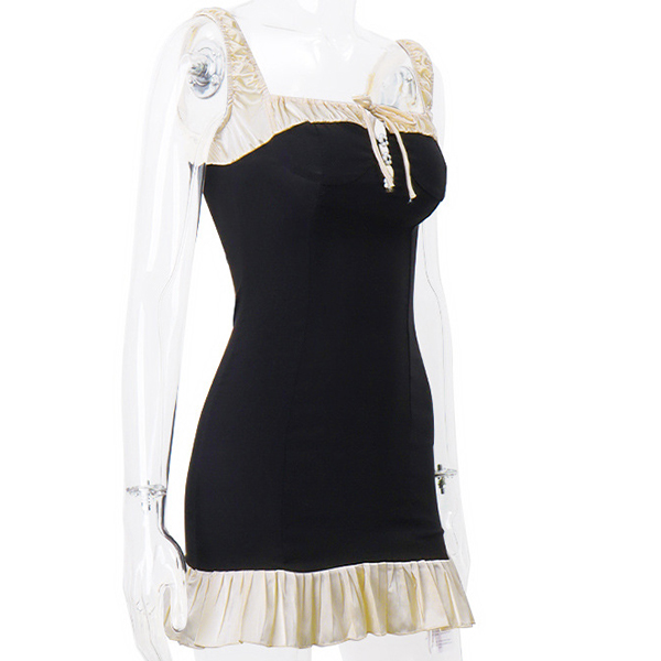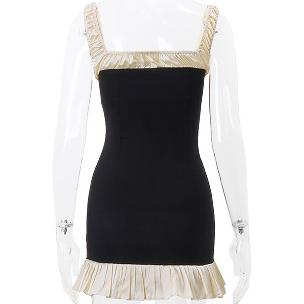 Fashion Contrast Color Ruched Square Neck Sleeveless Ruffle Hemline Bodycon Dress