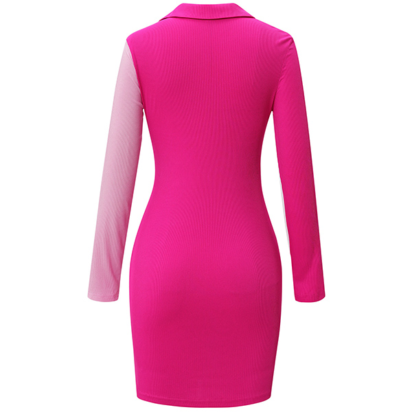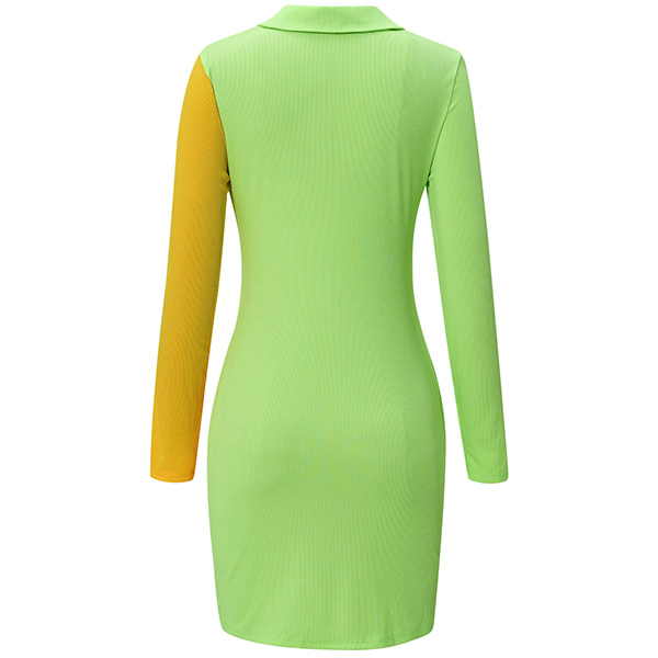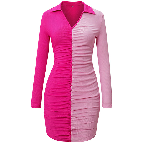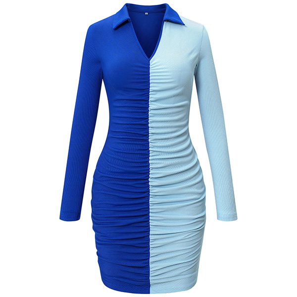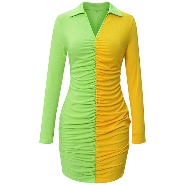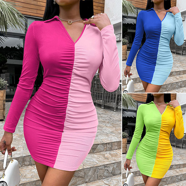 Fashion Contrast Color Ruched V-neck Stand Collar Long Sleeve Bodycon Dress