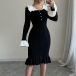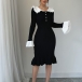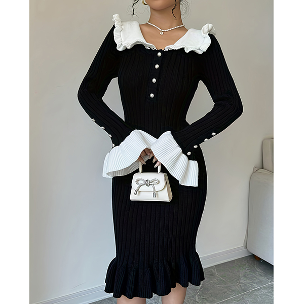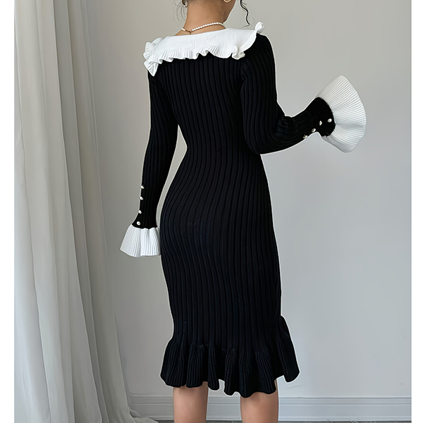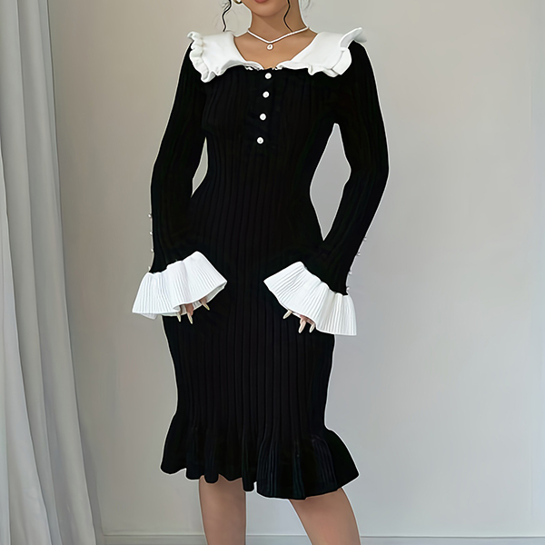 Fashion Contrast Color Ruffle Stand Collar Long Sleeve Bead Ribbed Dress
