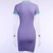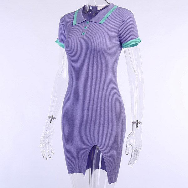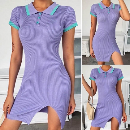 Fashion Contrast Color Short Sleeve POLO Collar Slit Hem Knit Dress