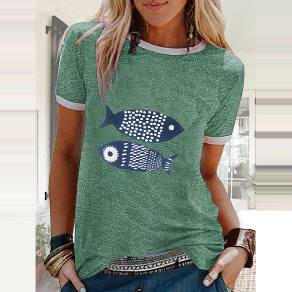 Fashion Contrast Color Short Sleeve Round Neck Fish Printed T-shirt
