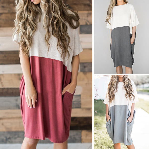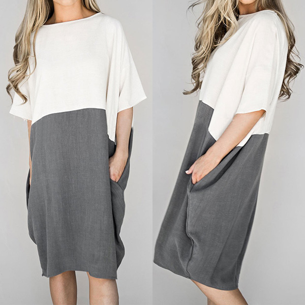 Contrast color style,designed with short sleeve,round neck,hand pockets and a loose silhouette,this dress is worth to be