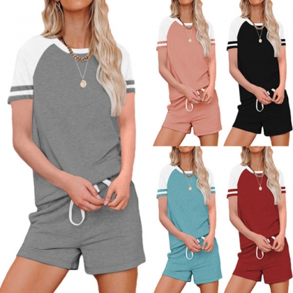 Fashion Contrast Color Short Sleeve T-shirt + Shorts Home-wear Two-piece Set