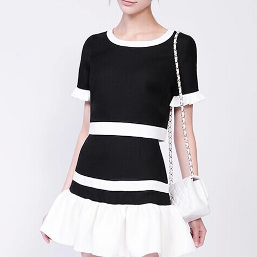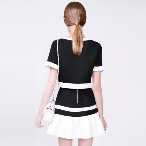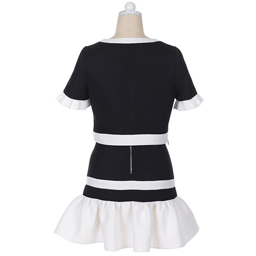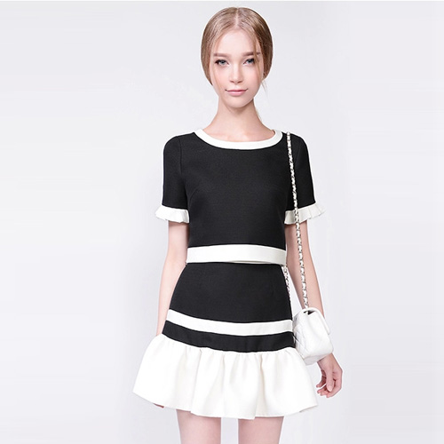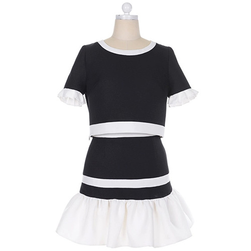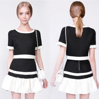 classical and stylish. Top with short sleeve,round neck and flouncing cuff design. Skirt with flouncing hemline design,