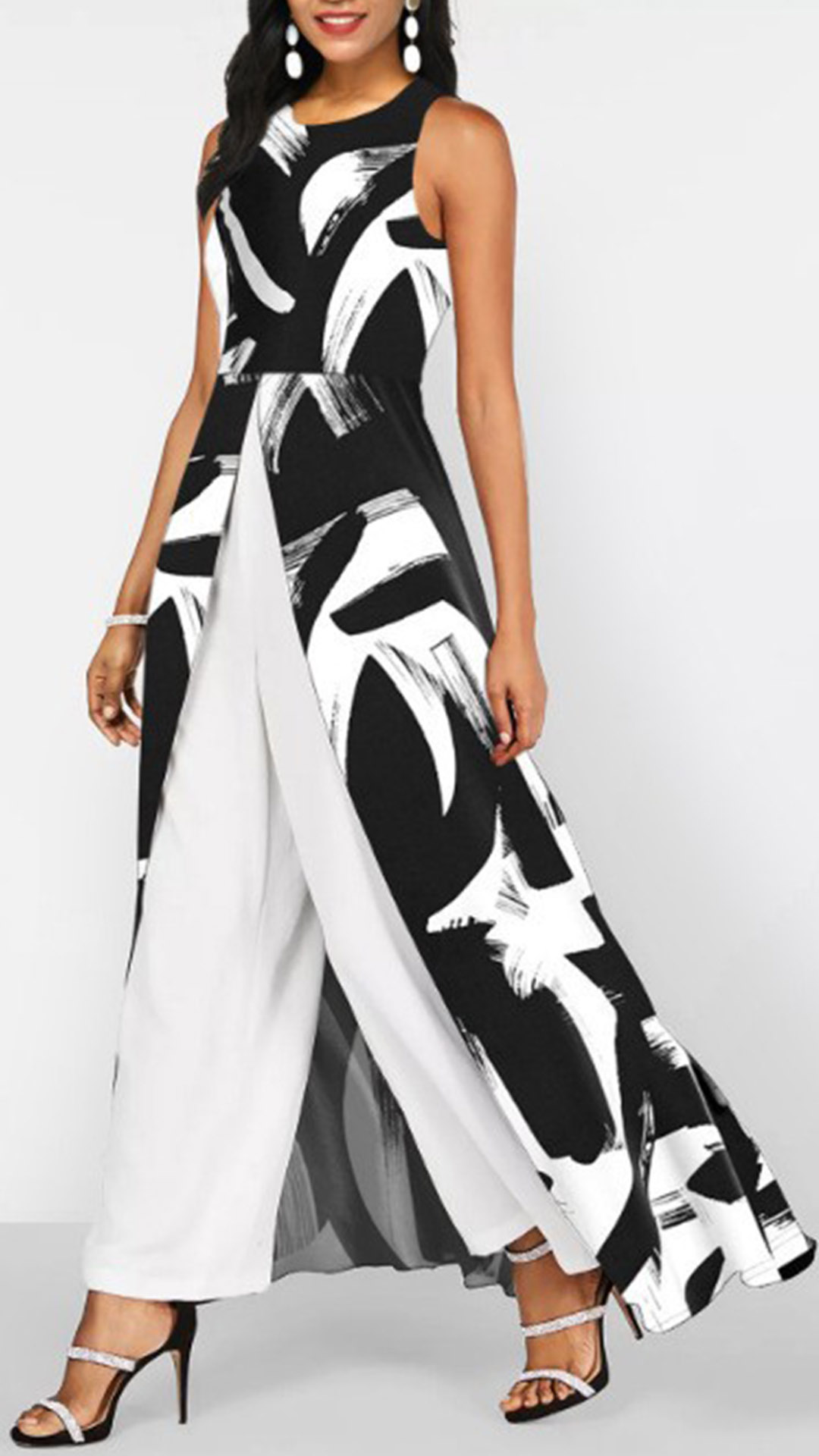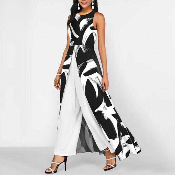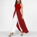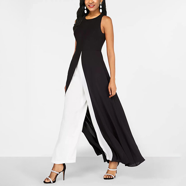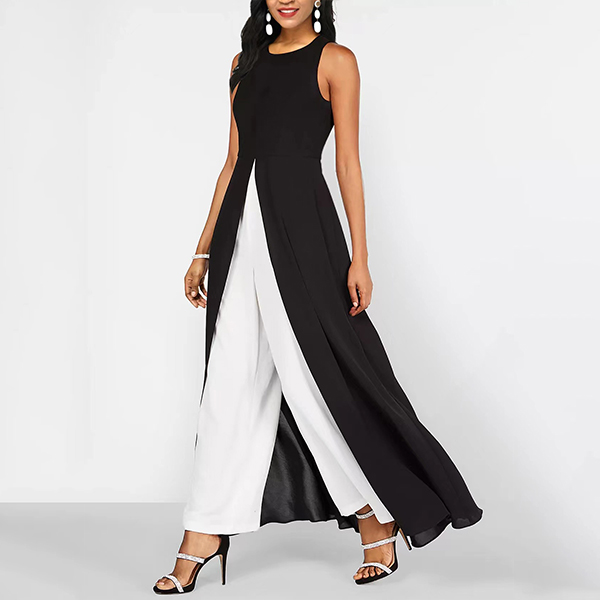 Look at this jumpsuit. The contrast color scheme adds a bold, graphic touch to the overall look. It features front slit, and faux two-piece look - combine to make a striking, contemporary jumpsuit. Wanna have a try?