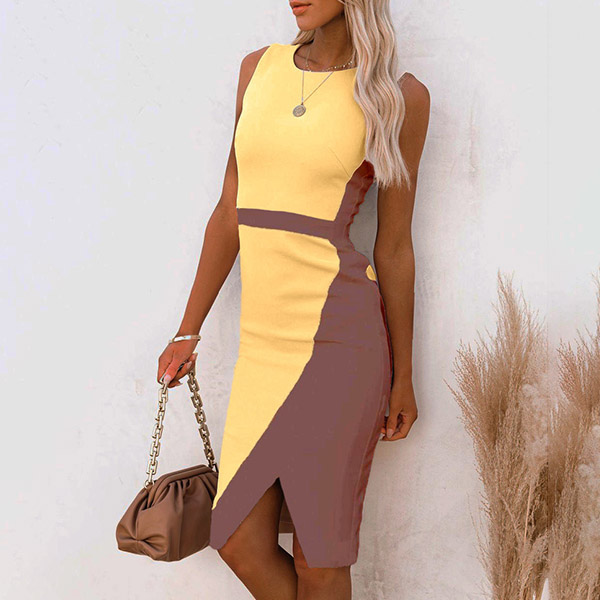 Fashion Contrast Color Sleeveless Round Neck Slit Hem High Waist Slim Fit Dress