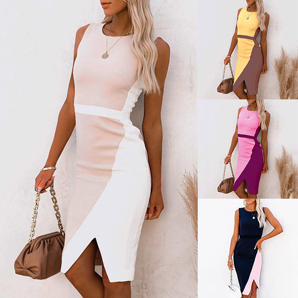 Embrace the warmth of a sunny weekend with a delightfully dress such as this creation. Contrast color design will make it look more stylish and attractive. Finished with sleeveless,round neck,high waist and slit hem design,this dress not only can showcase your slender figure,but also can exude your flirty and feminine side. So why not take interest in it?