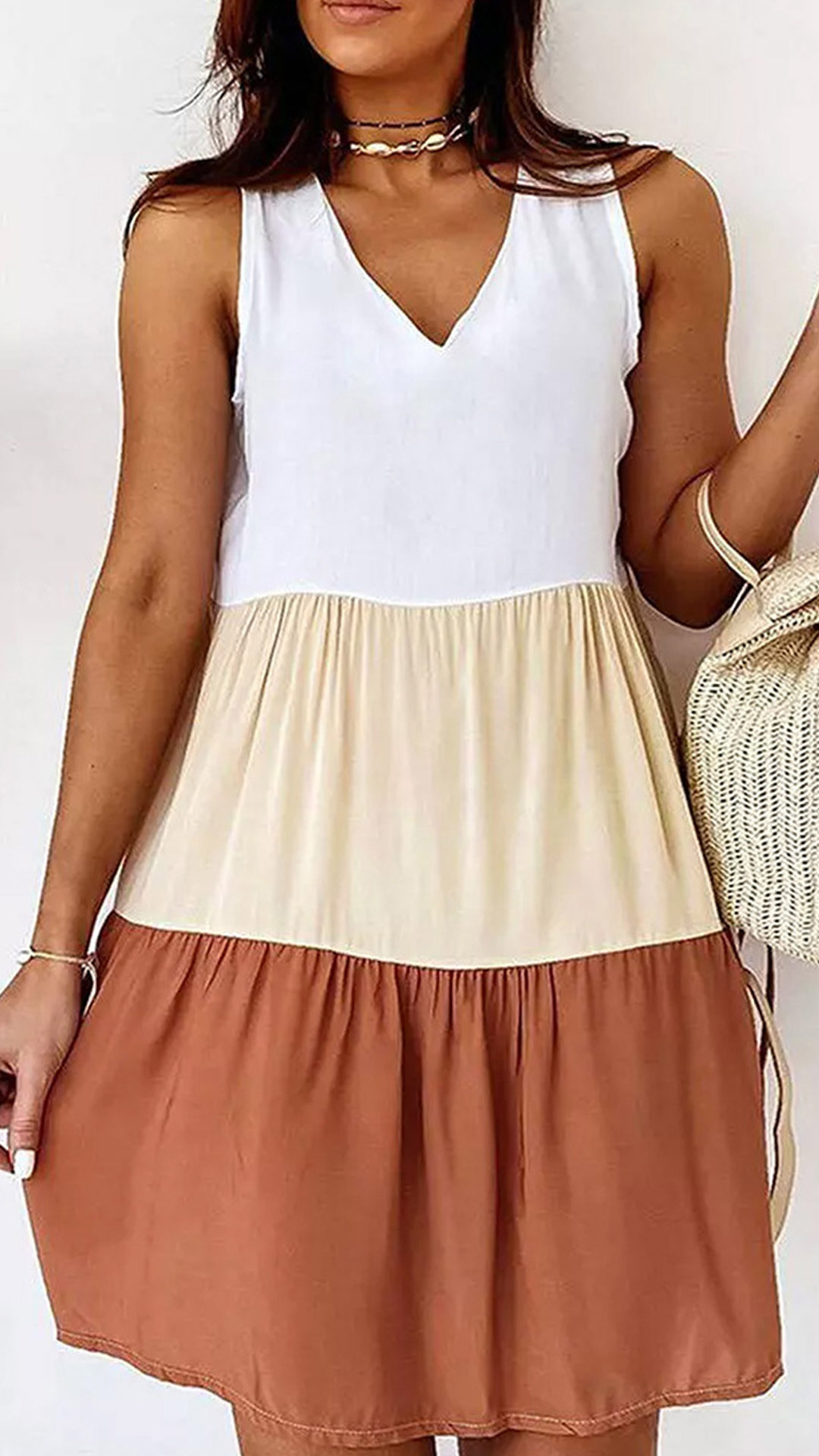 Hey,girls,you can update your summer wardrobe with this relaxed yet stylish dress. Contrast color design makes it look not so simple and dull. Finished with sleeveless,v-neck and a loose silhouette,this dress can keep the comfy while it maintains your style and personality.