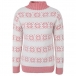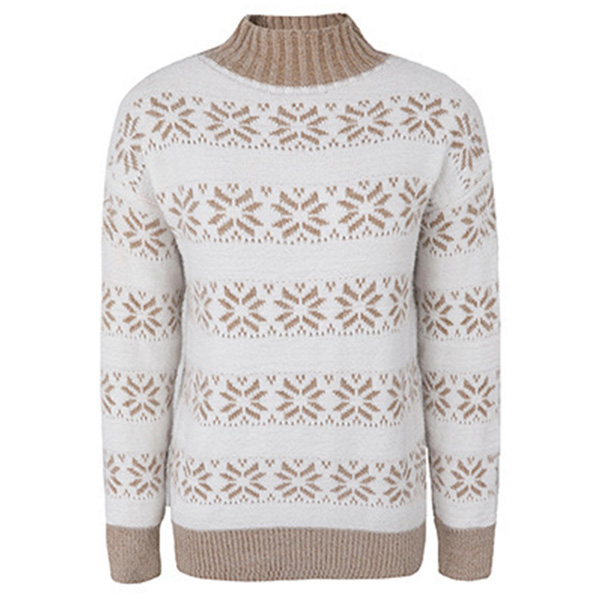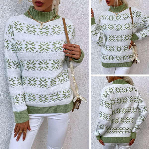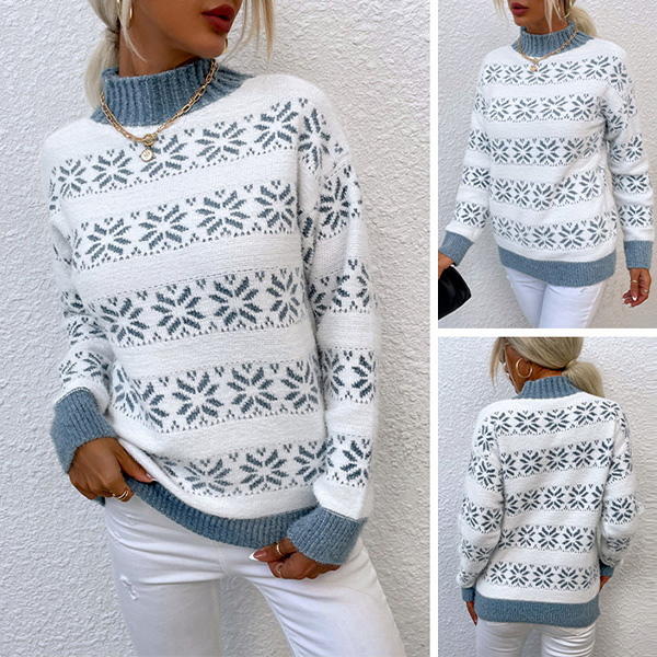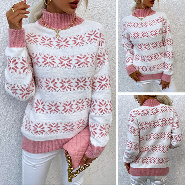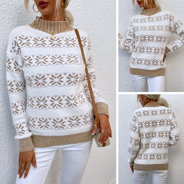 This sweater features a contrasting color design with snowflake patterns, creating a cheerful and holiday-inspired look. The mock neck and long sleeve provides warmth and adds a touch of sophistication. It is a stylish and festive choice for the Christmas season.