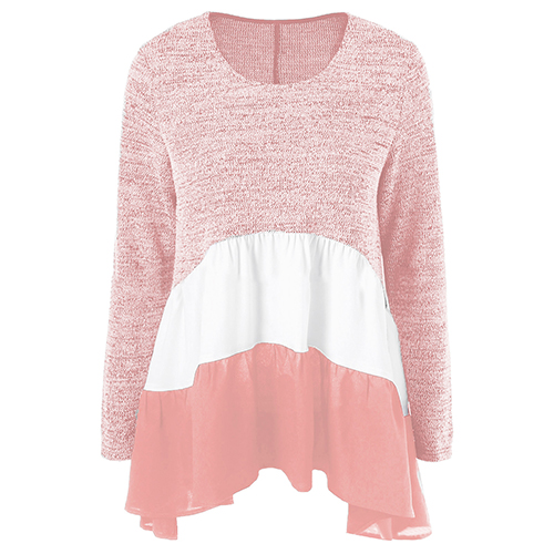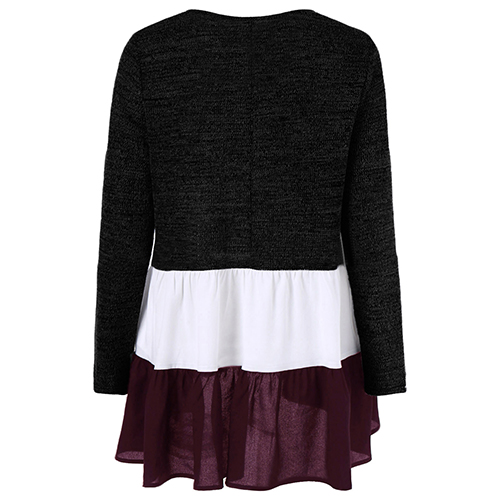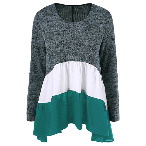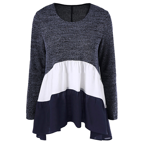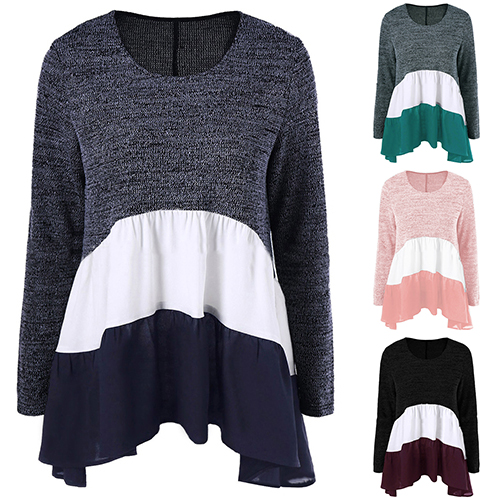 material. It is completed with contrast color spliced design and long sleeve round neck patterns, casual and