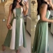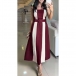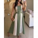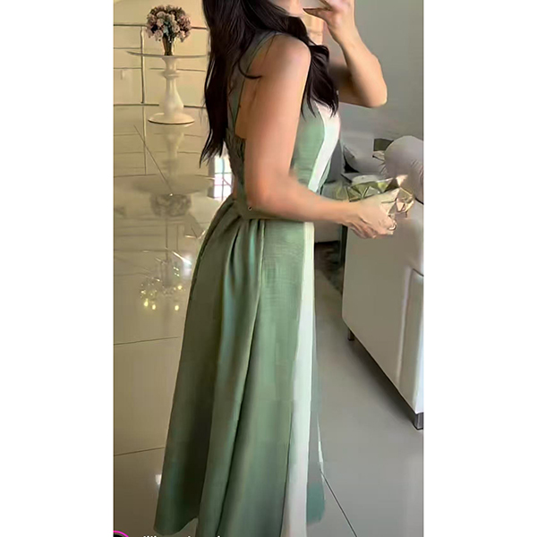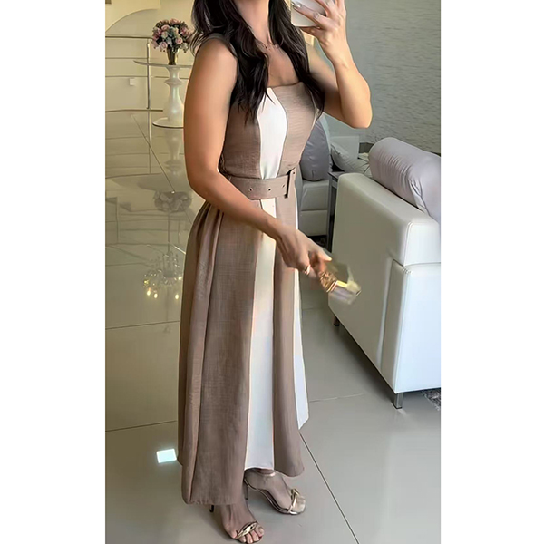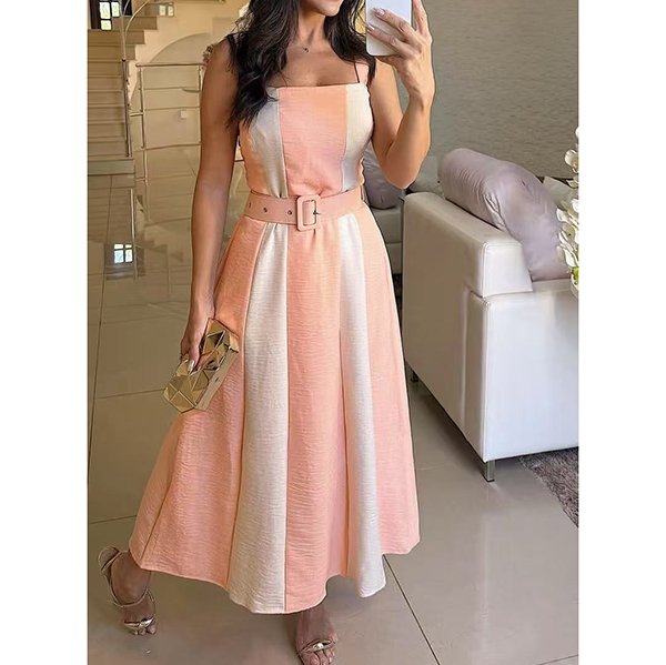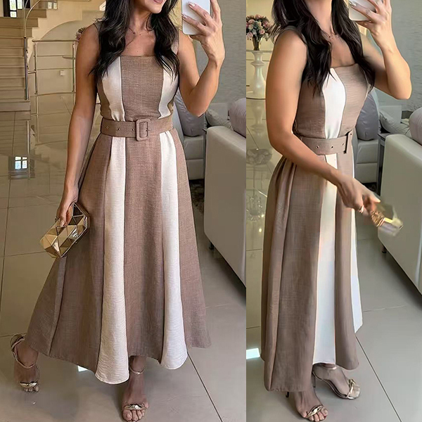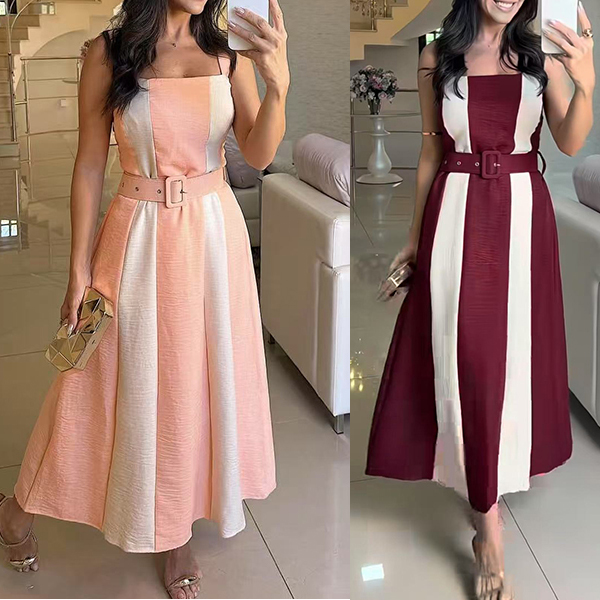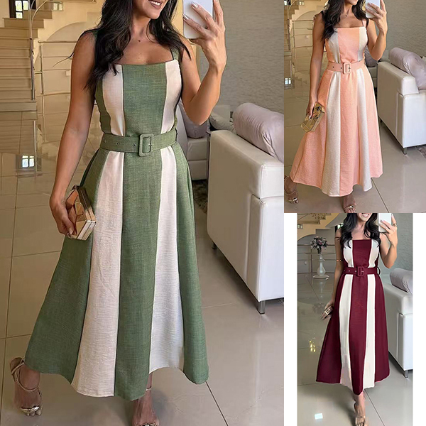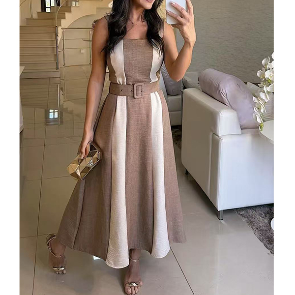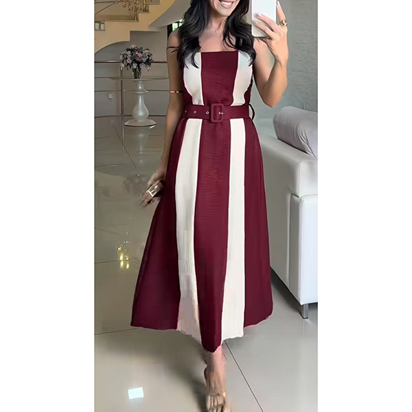 Fashion Contrast Color Square Neck Sleeveless Midi Dress with Belt