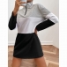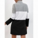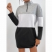This mini dress features dynamic contrast color styling with structured stand collar design and functional half-zipper closure for contemporary sporty elegance. Style with boots for a fashion look.