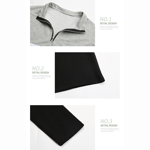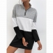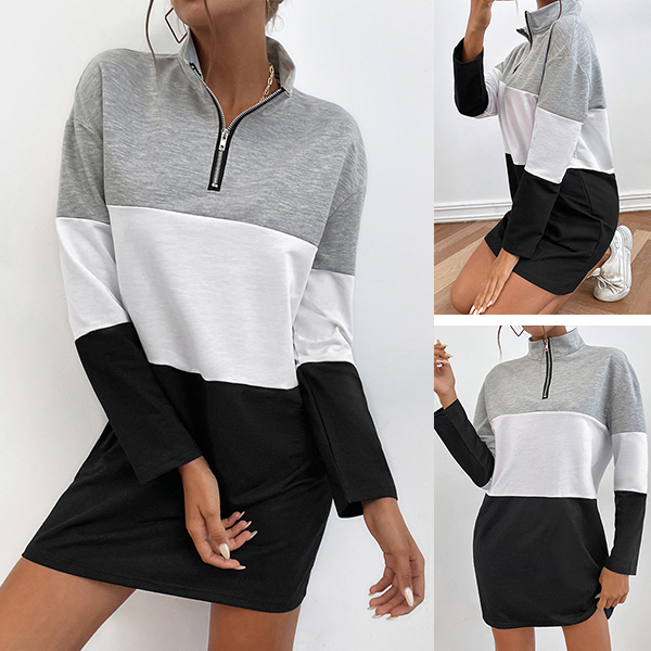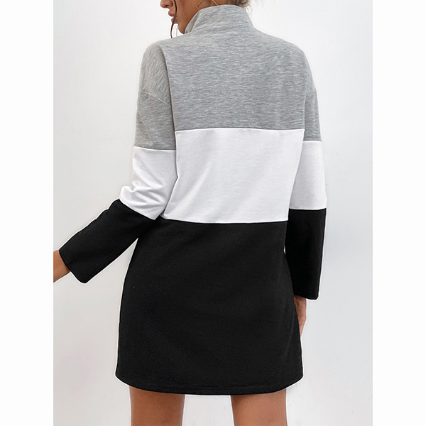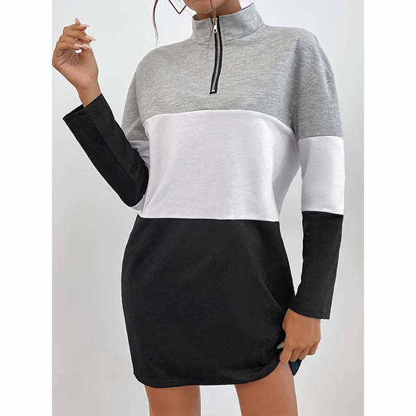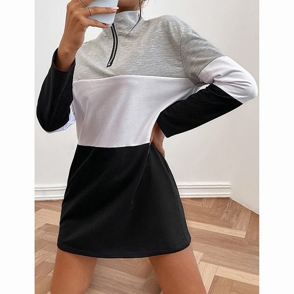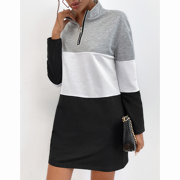 Fashion Contrast Color Stand Collar Half-zipper Long Sleeve Dress