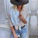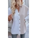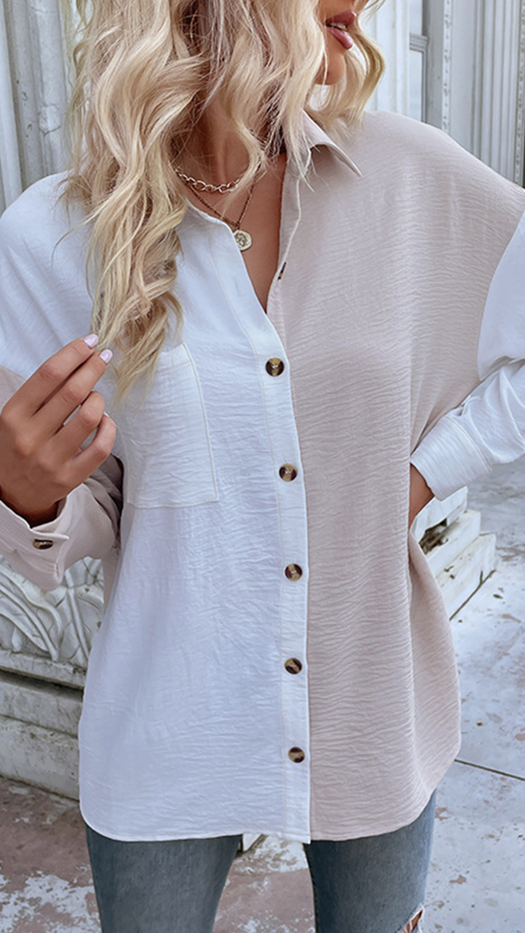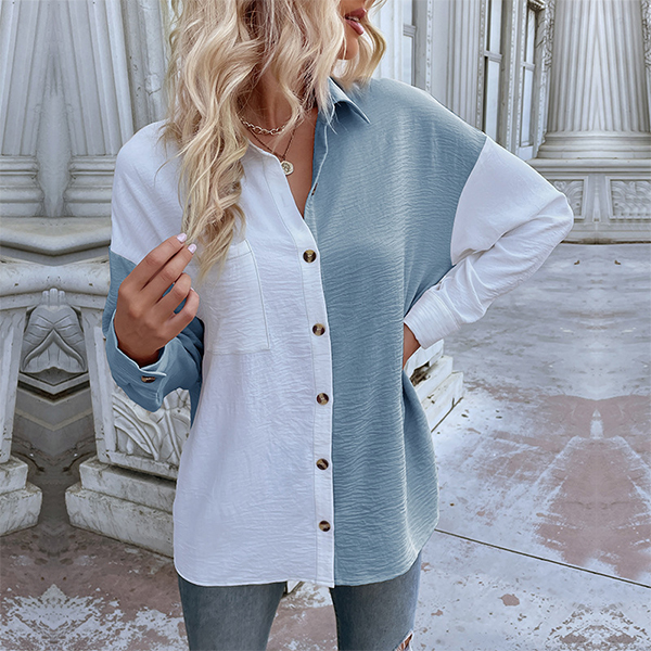 This blouse features a contrast color design, stand collar, and long sleeves, creating a chic and stylish look. Style it with jeans and sneaker for a more casual look.