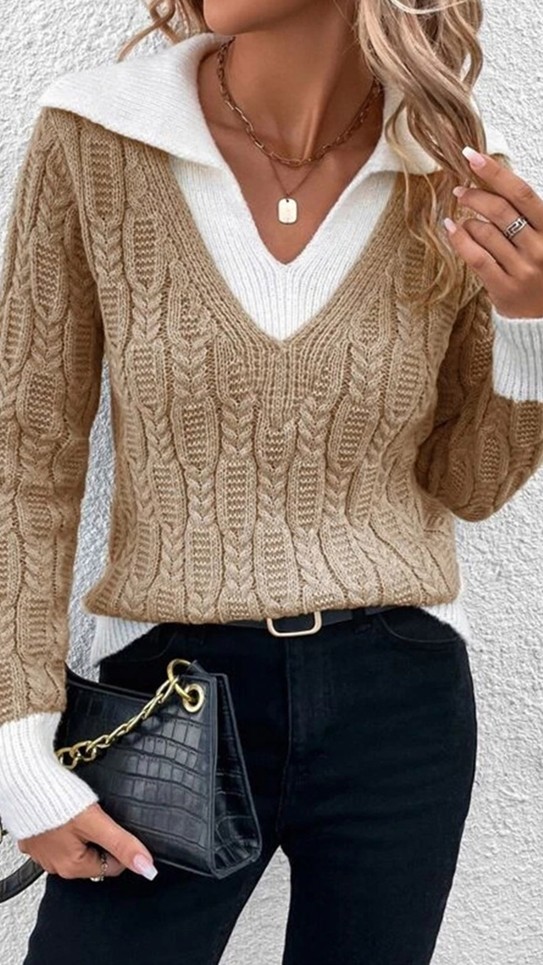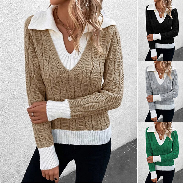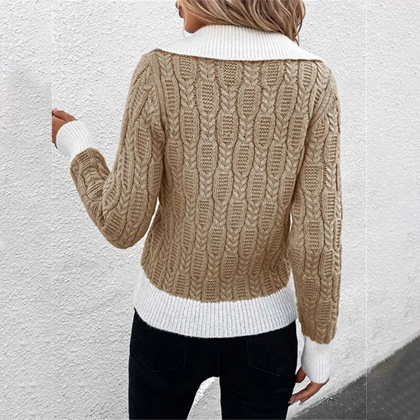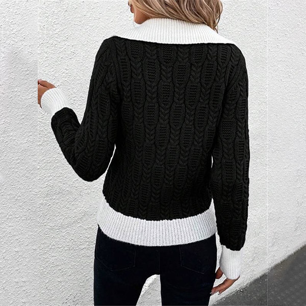Fashion Contrast Color Stand Collar V-Neck Long Sleeve Sweater