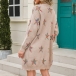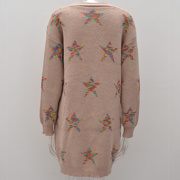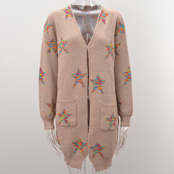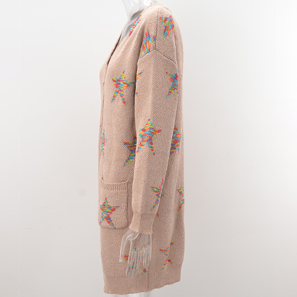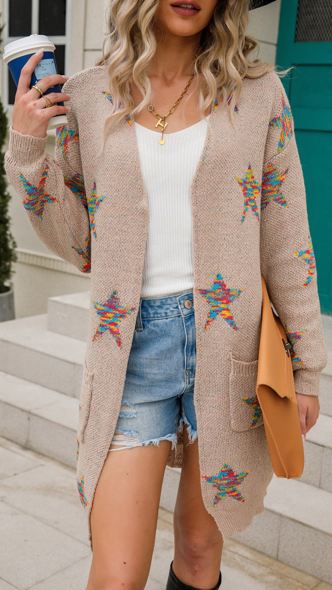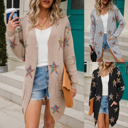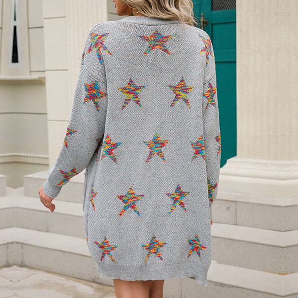 Fashion Contrast Color Star Pattern Long Sleeve Patch Pockets Knitted Cardigan