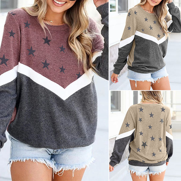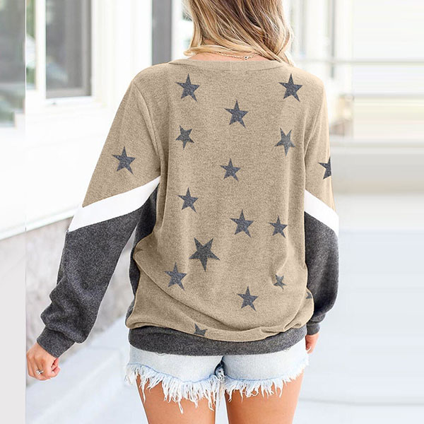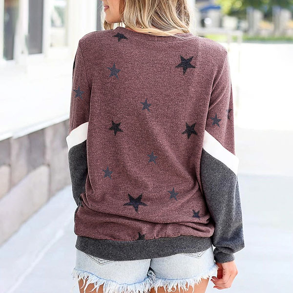 Fashion Contrast Color Star Printed Long Sleeve Round Neck T-shirt