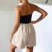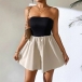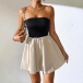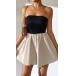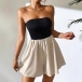 This is a chic and trendy romper that exudes contemporary flair and modern elegance. The contrast color design adds a striking and eye-catching element to the romper, creating a vibrant and playful look that is perfect for adding a pop of color to your outfit. The strapless neckline offers a sleek and sophisticated silhouette. Pair it with sandals or sneakers for a casual and laid-back ensemble.
