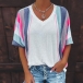 Fashion Contrast Color Stripe Half Sleeve V-neck Loose T-shirt