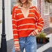 This sweater features a V-neckline and long sleeves, offering a classic and flattering silhouette. The contrast color stripe design adds a bold and dynamic visual element to the sweater, making it stand out. Knitted from cozy and comfortable fabric, it provides warmth and softness. Hope you like it.