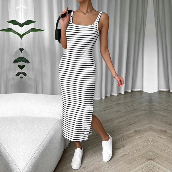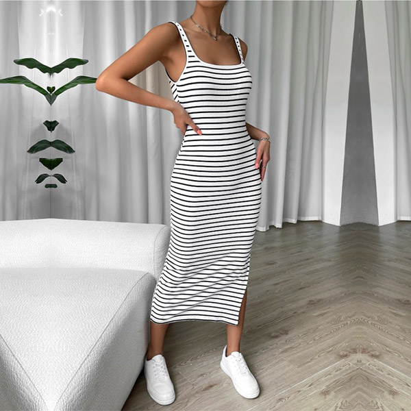 This is a stylish and vibrant dress that combines contrasting colors and stripe prints for a chic and playful look. The tank dress silhouette is perfect for warmer weather or for those who prefer a more relaxed and casual fit. Wanna have one?