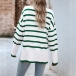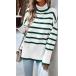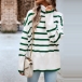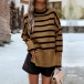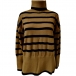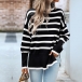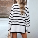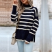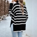 This versatile and fashionable top combines a bold, contrast-color striped print with a cozy turtleneck design and a modern side slit, creating a chic and on-trend look that effortlessly transitions from day to night.