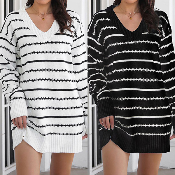 Featuring a trendy contrast color stripe design, this dress adds a pop of color and visual interest. The V-neckline adds a touch of femininity, while the long sleeves provide warmth and coziness. Made from high-quality knitted fabric, this sweater dress offers a soft and comfortable feel against your skin.