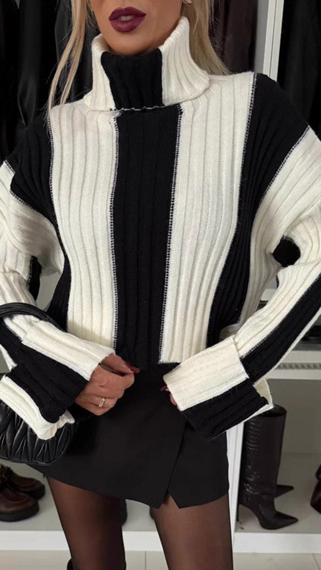 Add a pop of color to your winter wardrobe with this Sweater. This stylish sweater features a bold contrast color design that is sure to make a statement. The turtleneck provides extra warmth and a chic look, perfect for staying cozy in the colder months. Pair this sweater with jeans for a casual and stylish outfit~