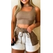 Fashion Contrast Color Two-piece Set Consist of Brown Crop Top and Drawstring Shorts