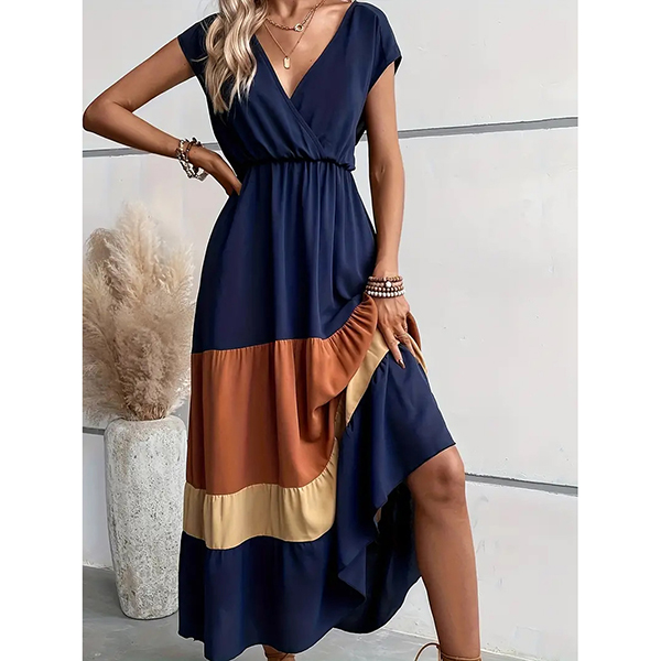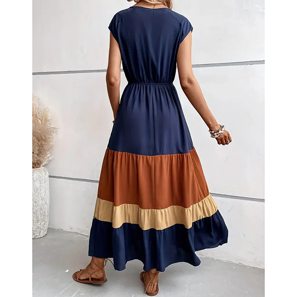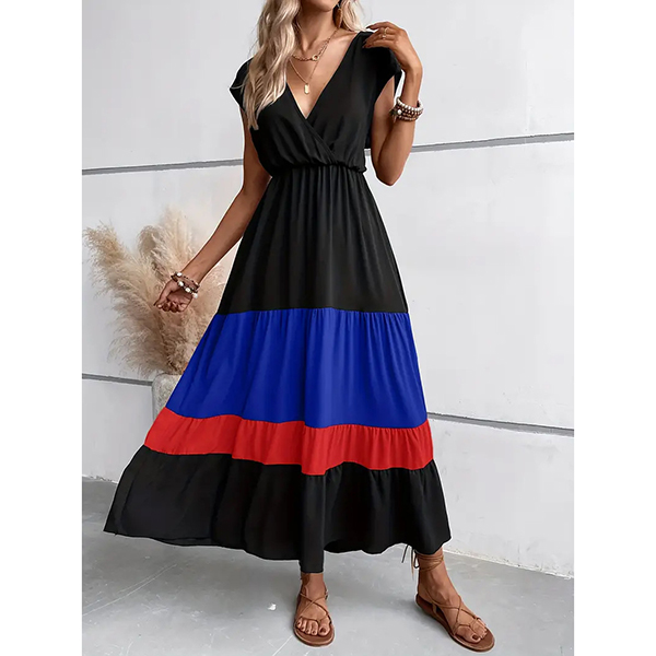 Fashion Contrast Color V-neck Cap Sleeve High-rise Tiered Maxi Dress