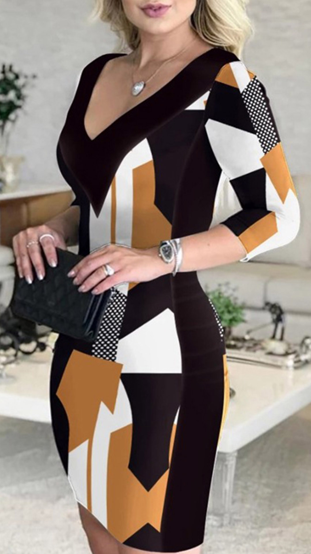 This gorgeous dress features a flattering bodycon silhouette that hugs your curves in all the right places, while the V-neckline adds a touch of elegance. The long sleeves keep you warm and cozy on cooler days, while the contrasting colors create a bold and eye-catching look that's perfect for any occasion.